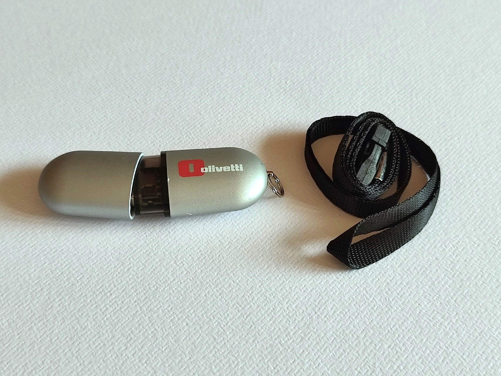 This selection features a personalized desk set with the Olivetti logo, including a mouse pad, a ballpoint pen, a notepad and a pendrive.