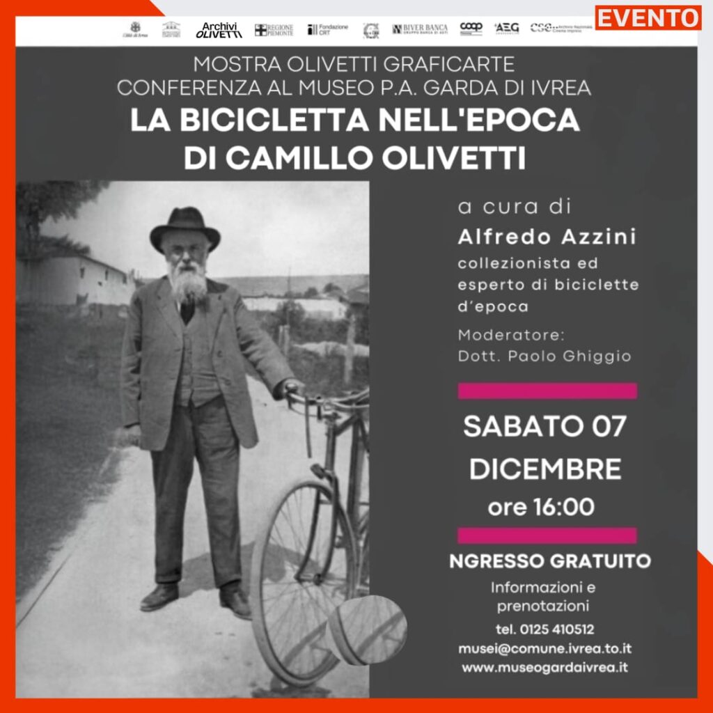 Nell’ambito della mostra Olivetti – Graficarte, il Museo Garda di Ivrea propone la conferenza La Bicicletta nell’Epoca di Camillo Olivetti tenuta da Alfredo Azzini, uno dei massimi esperti italiani di biciclette d’epoca e Presidente dell’Associazione Italiana Velocipedi (AVI) e della Commissione Nazionale Asi Velocipedi.
