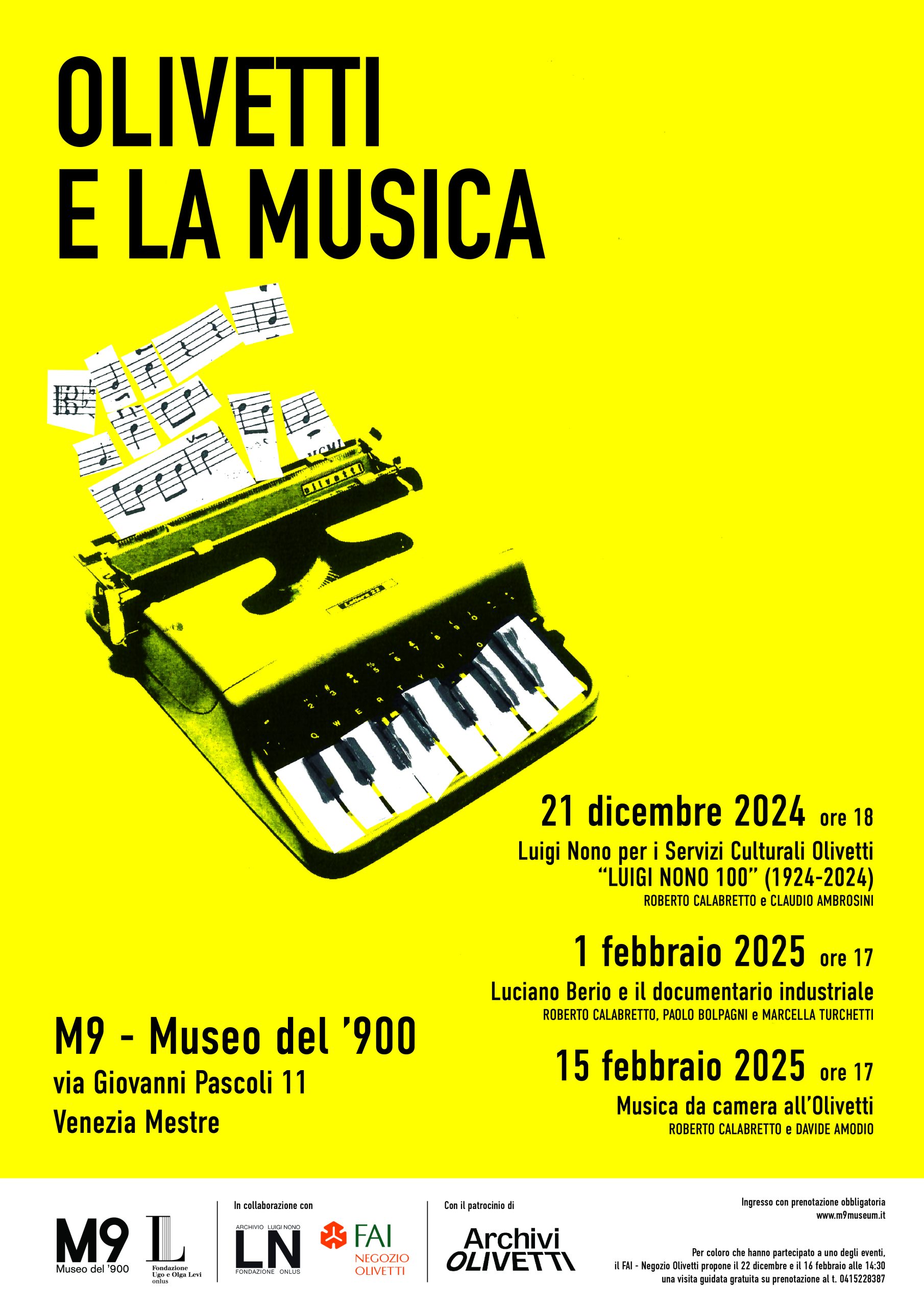L’Associazione Archivio Storico Olivetti ha dato il patrocinio all’intera iniziativa e partecipa all’incontro del 1° febbraio 2025 alle ore 17.00 dal titolo “Luciano Berio e il documentario industriale“: un appuntamento dedicato a due documentari prodotti dalla Società Olivetti con musica di Luciano Berio in cui note e immagini dialogano proponendo situazioni fortemente innovative e sperimentali. I due documentari, La memoria del futuro (Nelo Risi, 1960) ed Elea classe 9000 (Nelo Risi, 1960), saranno introdotti dal prof. Roberto Calabretto, presidente del comitato scientifico della Fondazione Levi, e Paolo Bolpagni esperto di storia dell’arte contemporanea, alla presenza di Marcella Turchetti dell’Associazione Archivio Storico Olivetti.
