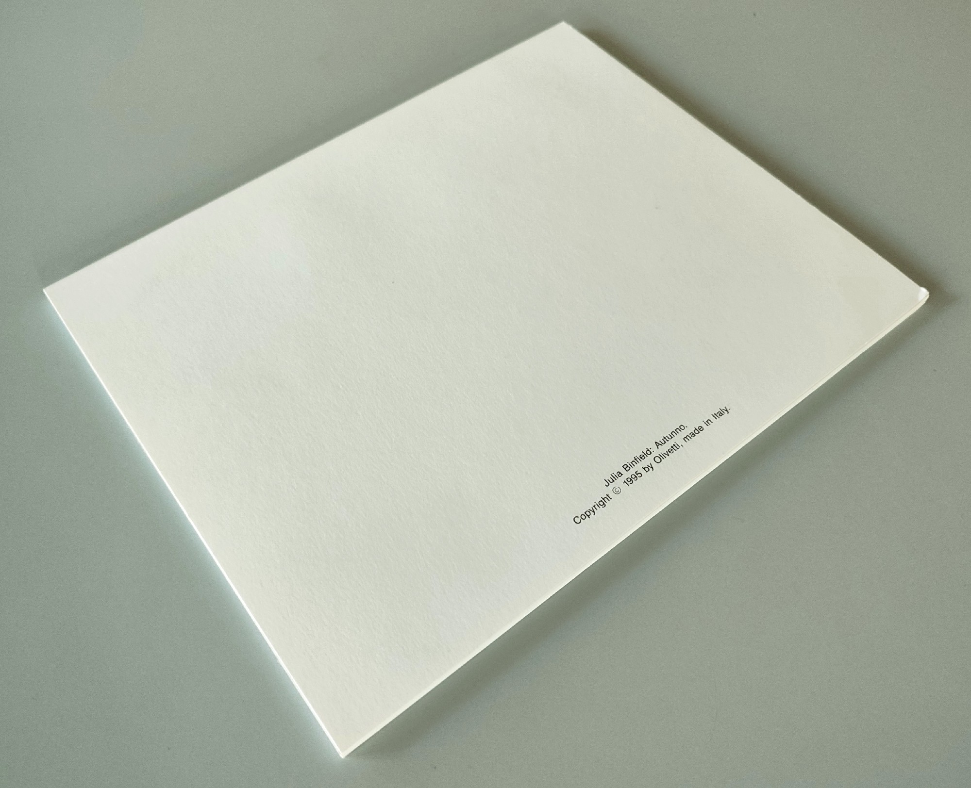 La tradizione Olivetti di creare oggetti omaggio che riflettano lo stile e la cultura dell’azienda continua con la serie di quattro block notes ispirati alle “Quattro Stagioni”, illustrati da Julia Binfield. Questo esemplare, ormai raro, rappresenta l’Autunno attraverso l’inconfondibile tratto dell’artista.